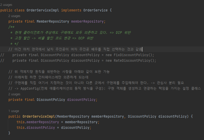 5. 이를 해결하기 위해서는회원 저장소와 할인 정책을 먼저 선언해주고 생성자를 통해 각각을 인터페이스로 의존성 주입해주면 된다.