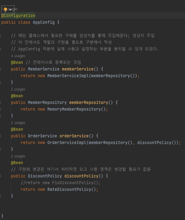 따라서 스프링 컨테이너를 적용한 방식은 다음과 같다. 먼저 AppConfig 클래스에서 어노테이션들을 설정해줌으로써 컨테이너로 등록해준다. @Configuration이라고 붙은 클래스를 ApplicationContext에서 참조해서 사용할 수 있고 @Bean 어노테이션이 붙은 매서드를 모두 호출해서 반환된 객체를 스프링 컨테이너에 등록한다. 이렇게 스프링 컨테이너에 등록된 객체를 스프링 빈이라고 한다. 이 매서드명으로 getBean 매서드를 활용해 스프링 빈을 찾아 참조할 수 있다.
