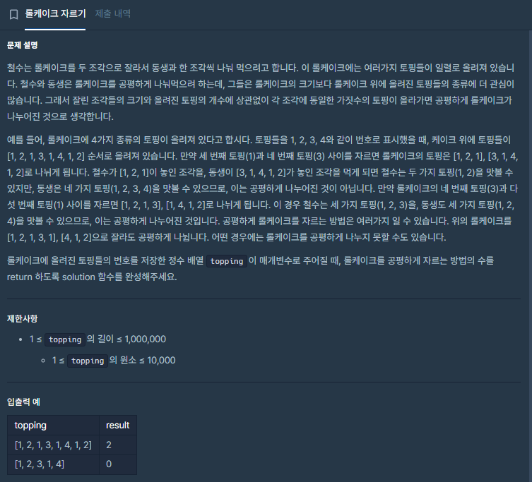 [240419] 알고리즘 리부트 52일차 - 프로그래머스 롤 케이크 자르기 자바 본문