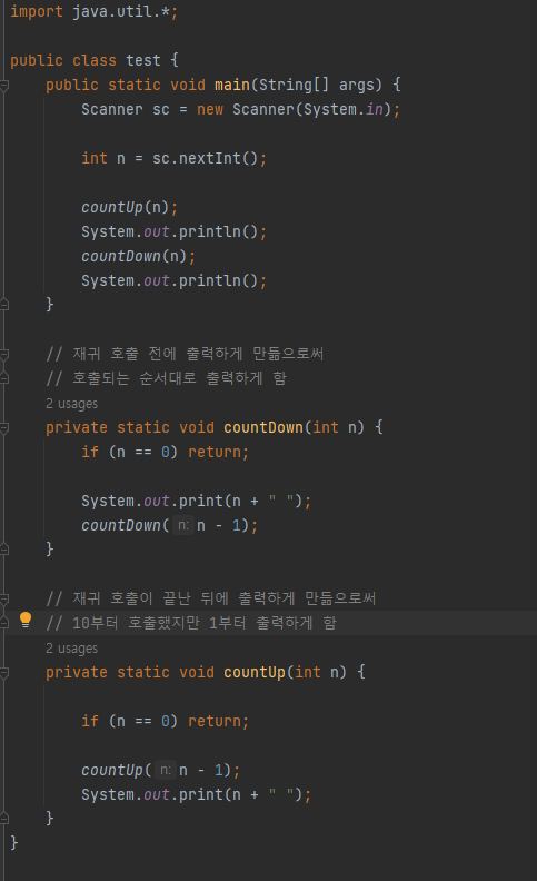 1부터 n까지의 수를 오름차순 및 내림차순으로 출력하도록 재귀를 구현하자.