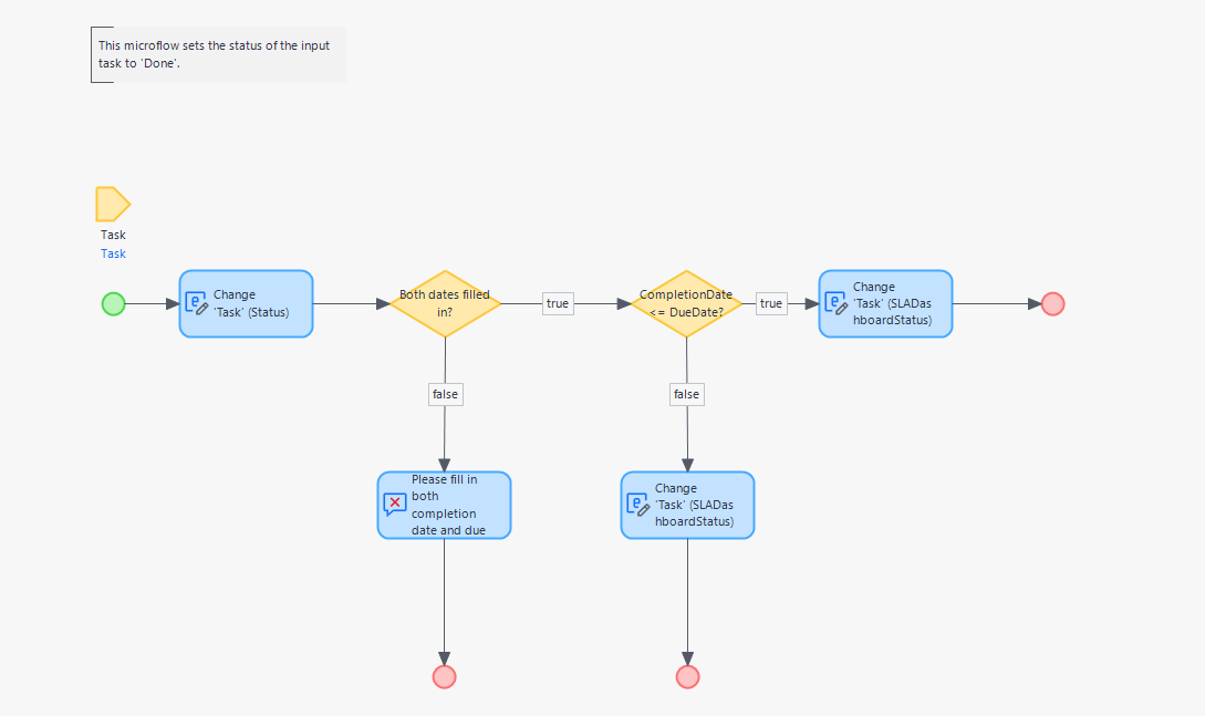 이런 마이크로 플로우가 사용되는 경우는 사용자가 어떤 행동을 했을 때 공통적으로 진행되는 로직을 만들어주는 것이다. 아래 마이크로 플로우는 사용자가 Task의 상태를 Done으로 바꾸려고 할 때 Task의 마감 기한과 마감일이 작성되었는지 여부와 둘 다 작성이 되었을 때 마감일이 마감 기한보다 이른 때인지에 따라 SLA 대시보드에 Task의 상태가 적합하게 표시 되도록(Achieved or Missed) 작성하는 것이다.