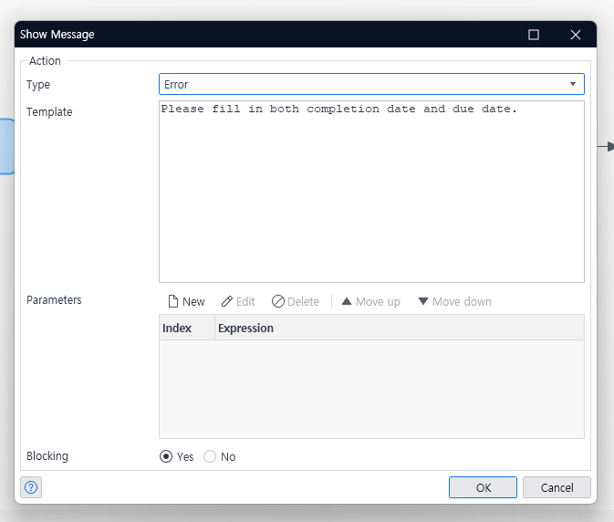 아래 이미지는 이렇게 작성된 마이크로플로우가 적용되어 마감일이 등록되지 않았을 때 done을 클릭하면 뜨는 안내메세지이다. 그 아래는 최종적으로 대시보드에 보이는 task의 status이다.