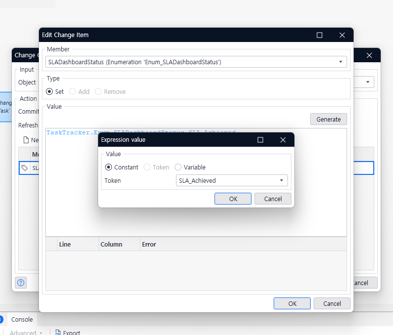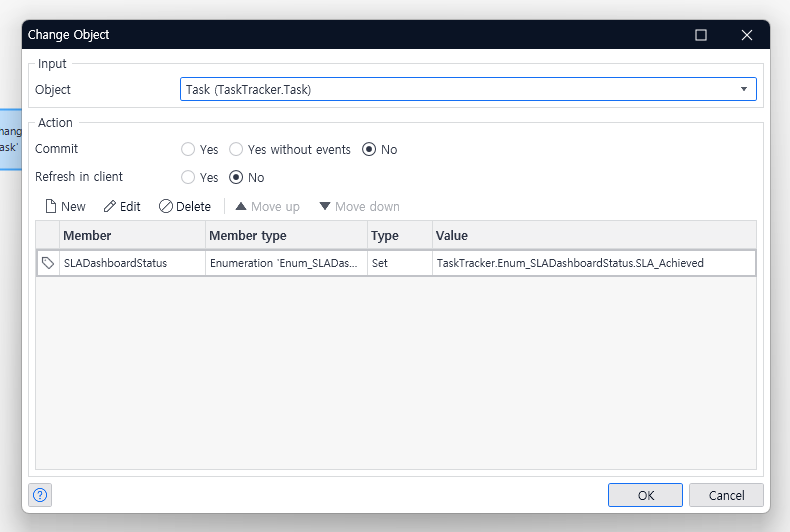 위 액티비티는 객체의 상태를 변경시키는 것이다. 여기서는 Task라는 Entity의 Attribute 중 하나인 SLADashboardStatus를 변경시키는 것이다. new 버튼을 클릭해서 변경하고자 하는 멤버를 선택하고 지정하고자 하는 값을 Token으로 설정해주면 된다.