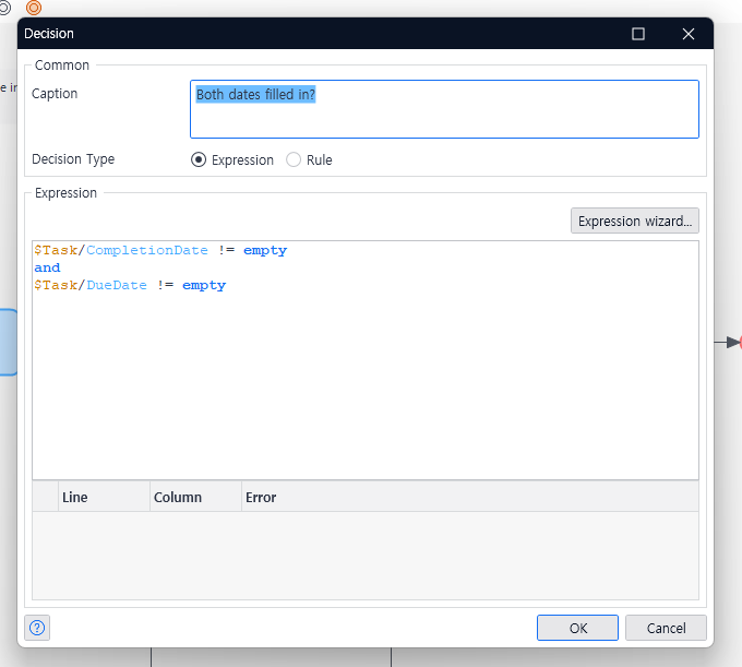 위 이미지는 로직 봇이 제공하는 add a decision을 클릭했을 때 노란 마름모꼴이 추가되고 이를 설정하는 화면이다. Caption부분은 마이크로플로우 액티비티에 표시되는 문구이고 아래 expression은 실제로 판단하는 로직을 작성하는 부분이다. * 컨트롤과 스페이스바를 동시에 누르면 제안사항이 나옴