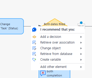 이미 작성되어 있는 마이크로 플로우의 액티비티 근처로 커서를 가져가면 작은 파란원이 나오는데 이는 멘딕스에서 제공하는 멘딕스 어시스트 로직 봇이 제공하는 작업이다. 수백만개에 달하는 마이크로 플로우로부터 '요 부분 정도에 어떤 액티비티가 추가되더라~ '와 같은 제안을 하는 것이다.