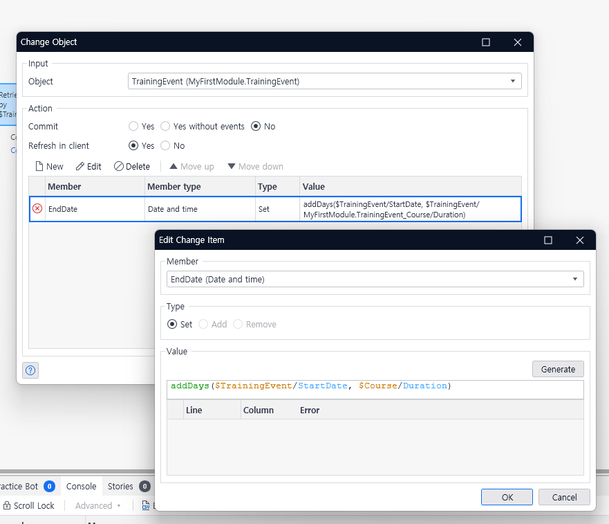 따라서 새로이 훈련과정의 EndDate를 계산하기 위해서는 마이크로플로우의 데이터 범위에 Course를 검색해서 포함시켜줘야 한다. 모든 마이크로플로우는 왼쪽에서 오른쪽으로 흐르기 때문에 객체 변경 activity보다 먼저 검색을 실행한다.