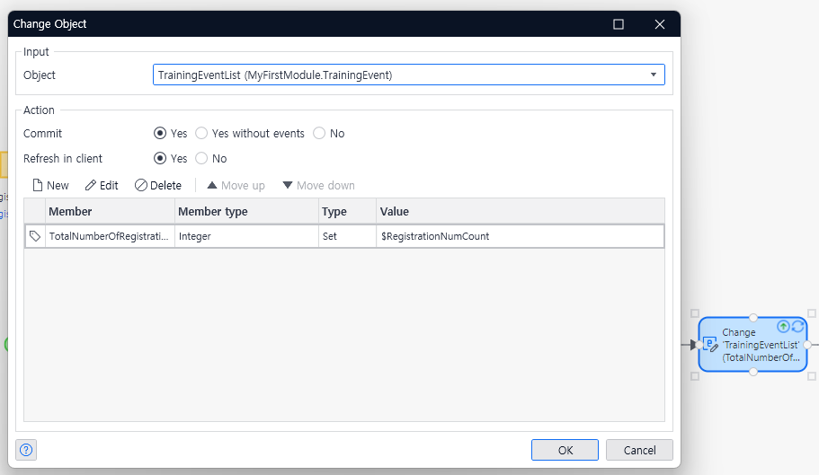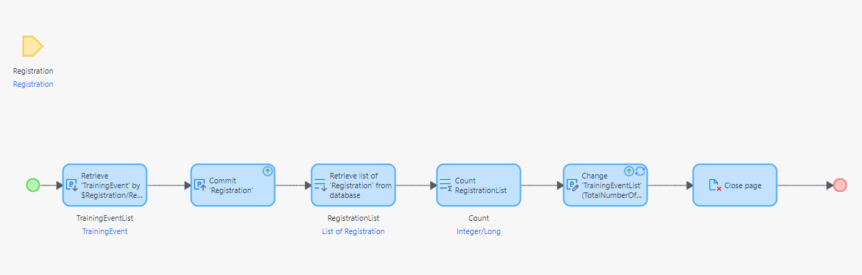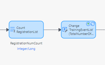 이후 사용자가 등록한 내용을 데이터베이스에 저장한다. 그 다음 해당 훈련과정에 총 등록된 수를 가져와야 하는데 현재 마이크로플로우 범주에는 직전의 추가한 객체만 존재하기 때문에 해당 훈련과정에 총 몇명이 등록했는지 알 수 없다. 따라서 데이터베이스에서 최종적으로 저장된 등록 교육생 수를 가져온다. 이 때 엔티티의 'Registration'이 아닌 현재 TraininEventList에 속한 Registration을 선택해주어야 우리가 의도한 현재 훈련과정의 등록 수만 추출해낼 수 있다.