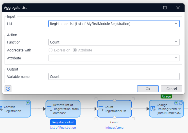 그 다음 집계 리스트(aggregate list) activity를 추가하고 count 함수를 실행한다. 이 때 입력 값은 당연히 등록 수이다. 변수명이 함수명과 혼동될 여지가 있어서 아래와 같이 변수명을 변경했다.