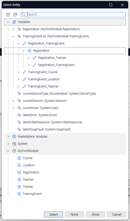위 마이크로플로우는 해당 기능을 수행하기 위한 로직인데 지금까지 로직 중 가장 복잡하다. 일단 "등록"이라는 기능은 특정 "훈련 과정"의 등록이라는 제약이 있다. 이 등록 버튼으로 넘어 온 화면에서는 어떠한 TrainingEvent인지 마이크로플로우가 탐색할 수 없는 범위의 데이터를 활용해야 하는 상황이 된다. 따라서 현재 선택한 훈련과정을 연관 방식으로 검색해서 이 등록의 기능이 적용될 TrainingEvent를 찾아 참조할 수 있게 만들어야 한다.