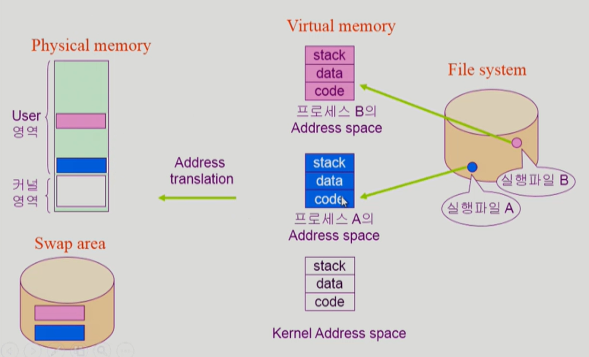 각 프로그램마다 독자적으로 가지고 있는 연속적으로 존재하지는 않는 가상의 메모리 공간이 있고 이를 address space라고 한다. 이 중 실제로 실행되는 당장 필요한 것들만 physical memory에 담기고 이때 가상의 주소공간이 물리적인 메모리에 담기면서 주소는 변환된다. (전체를 다 담으면 메모리 낭비) 당장 필요하지 않은 부분은 disk의 swap area에 내려놓게 된다.
