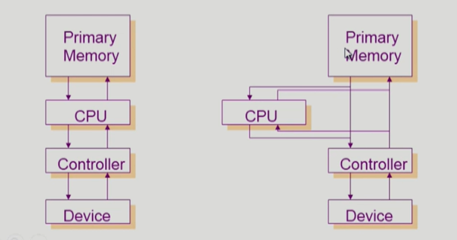 DMA는 메모리에 접근할 수 있는 장치로서 원래 그 역할을 CPU만 가능했는데 I/O 장치로부터 요청이 왔을 때마다 CPU에 인터럽트를 걸어버리면 CPU가 인터럽트를 너무 많이 당해 효율적이지 못하게 된다. 따라서 DMA 장치를 만들어놓고 메모리에 접근할 수 있게 하여 작은 일들은 CPU 대신 처리할 수 있게 한다. 로컬 버퍼가 어느정도 쌓이면 DMA 컨트롤러가 메모리에 쌓고 어느정도 블록의 형태로 쌓이면 CPU에 인터럽트를 건다. 빈도를 줄이고 효율성 높일 수 있음
