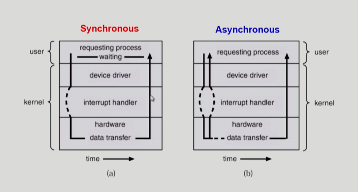 입출력 요청후 작업이 완료되고 나서야 사용자 프로그램으로 CPU 제어가 넘어간다.