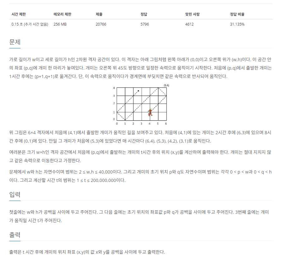 강의에서의 풀이 인사이트는 아래와 같다. 아래의 풀이는 모듈러를 활용해 주기성을 제외하고 한 칸 씩 이동해 최대 4만번의 연산을 수행하는 풀이이다. 행과 열의 경계에 대해서 각 행과 열의 2배의 주기를 가진다는 것을 파악했기 때문에 모듈러를 활용해 X(T) = X(T%2W) 임을 알 수 있다. 여기서 4만이 최대라서 가능한 부분이지 만약 시간 제한을 넘는 입력값이 주어진다면 또 다시 시간초과가 발생한다.