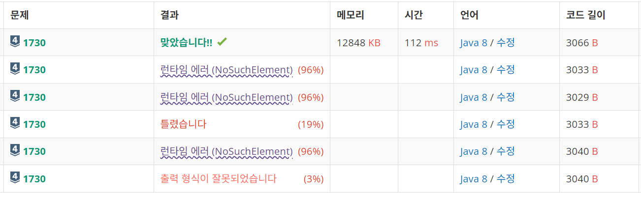그리고 마지막으로 런타임 에러를 발생하게 했던 것은 이상하게 로봇 팔의 움직임 횟수가 0이라는 제약이 없는데도 Scanner가 입력을 받지 못해 오류가 발생하는 것이었다. hasNext()로 확인 후 처리하게 해서 정답처리를 받았다. 강의에 따르면 명령의 수가 최대값 250이라는 것만 정의되어 있고 최소에 대한 설명이 없기 때문에 그렇다고 한다. No Such Element라는 오류가 난다면 읽을 값이 없다는 것이니까 잊지말자!