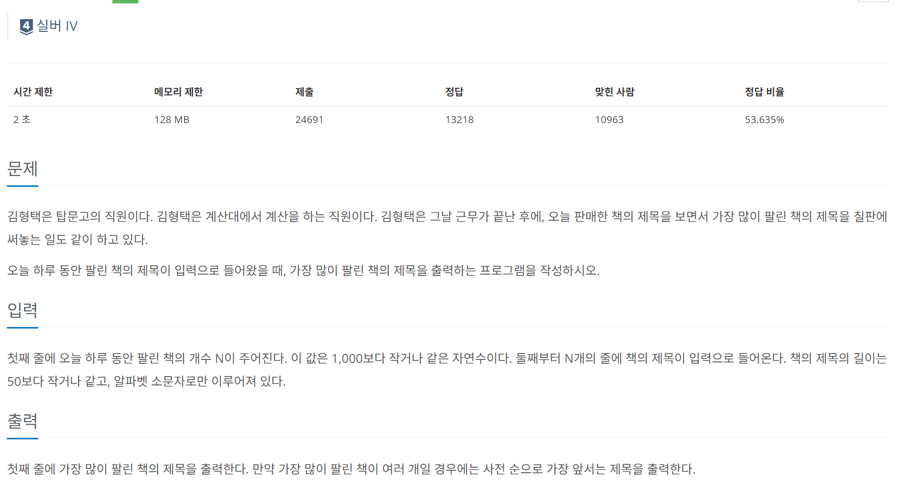 해시 맵으로 판매권수와 책제목을 담았다. 나는 맵을 정렬해야 한다는 생각에 갇혔었는데 매번 최대 권수를 갱신하고 해당 최대권수를 가진 책들 중에서 사전 순으로 앞선 제목을 가진 책을 뽑아주면 되는 문제였다. 여기서 아직도 의문이 드는 것은 책제목의 초기값을 무엇으로 잡아야 하는지였다. 일단 z보다 더 뒤의 문자는 없어서 이렇게 작성했지만 만약 zz라는 책 제목이 있고 zzz라는 책 제목이 있으면 답은 zz가 나와야 하는데 존재하지도 않는 z가 답이 되어버리는 것이다. 여튼 아래 코드는 정답처리는 되었지만 결함이 있다고 볼 수 있다.