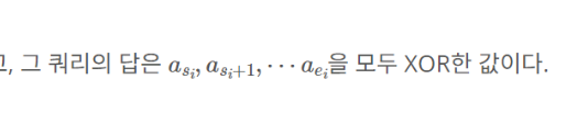 구간합 강의를 듣고 나니 이 문제가 구간합 문제와 동일하다는 것을 알게 되었다. 로직을 직관적으로 이해하려면 백준 11659를 풀어보면 되는데 아래 이미지의 문구가 이 문제는 구간합 문제(여기서는 합 대신 XOR 연산을 함)이라는 것을 보여주는 문구이다. 그래서 아래 코드를 보면 입력을 받음과 동시에 직전 배열의 원소와 XOR 연산을 한다. 또 쿼리에 대해 시작점과 끝점을 주고 시작점 직전의 원소와 끝점의 원소를 XOR 연산 해주는데 이렇게 처리하면 시작점 이전까지의 누적된 XOR 결과값을 제외할 수 있기 때문이다.