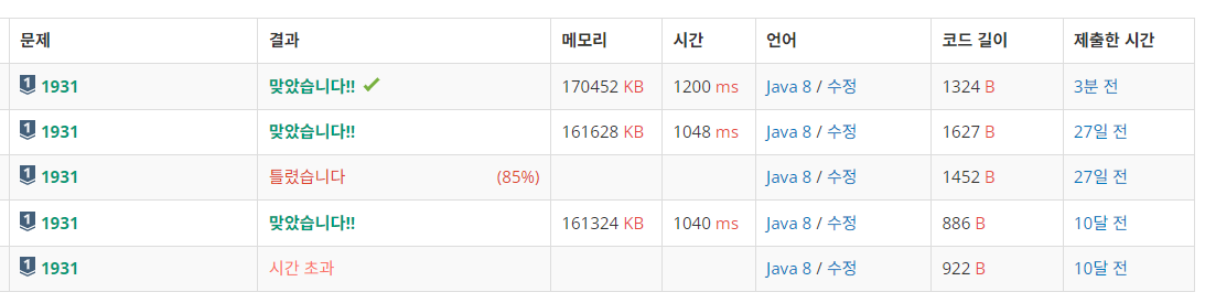 [240229] 알고리즘 리부트 20일차 - 백준 1931 자바 본문