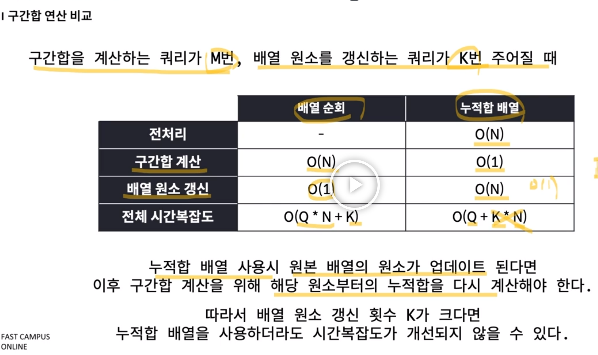구간 합 계산 시 누적합 배열을 활용한다면 해당 인덱스로 접근하여 한 번에 연산이 가능하기 때문에 시간 복잡도가 현저히 낮아진다. 해당 특정 배열의 원소가 갱신된다면 해당 원소의 인덱스부터 그 이후 모든 누적합 원소에 수정이 필요하기 때문에 배열의 길이인 N만큼 순회해야 하므로 시간 복잡도는 O(N) 이다. 만약 갱신하는 것을 반영해 구간합을 구한다면 누적합 배열을 사용한다 하더라도 시간 복잡도가 크게 낮아지지 않는다는 것을 알 수 있다.