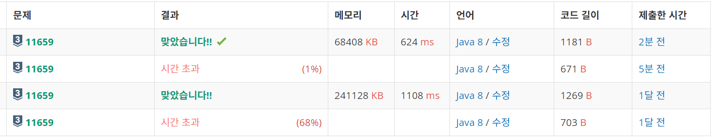 한 달 전에도 풀었던 문제인데 시간 초과 때문에 Scanner 대신에 BufferedReader와 StringTokenizer를 사용했고 String 대신 StringBuilder를 사용했다. 입력을 받을 때부터 구간 합을 구하며 각 요소는 첫 요소부터 해당 요소까지의 합이 되게 한다. 배열을 채우고 구간의 시작점과 끝점을 주기 때문에 끝점에서 시작점 바로 이전 인덱스의 값을 뺀다면 해당 구간의 합을 구할 수 있다.