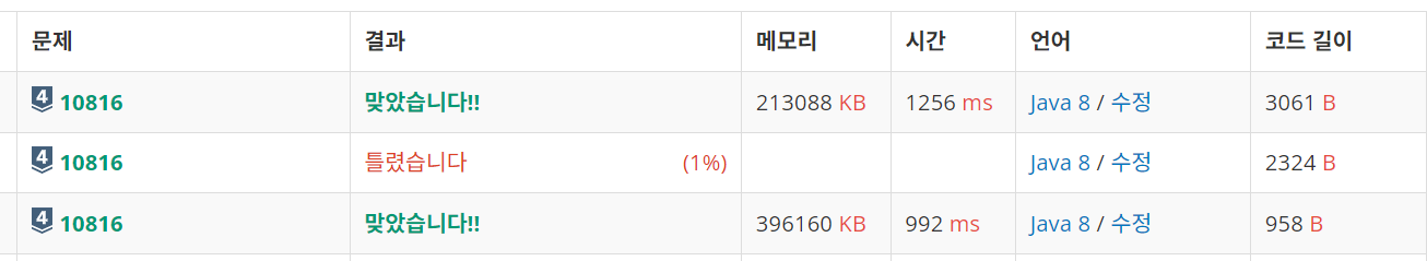 주어지는 수의 최댓값이 int를 넘어가지 않아 배열로 풀어봐야겠다는 생각을 하게 되었고 카운팅 배열을 구현하여 문제를 풀었다. 메모리는 굉장히 많이 사용했지만 인덱스로 접근하는 방식 덕분에 시간은 훨씬 적게 걸린 것을 알 수 있다. 다만 주어지는 수 중에 음수가 존재해서 모든 입력 받는 수에 천만을 더해 음이 아닌 정수의 구간에 들어오게 처리했다.