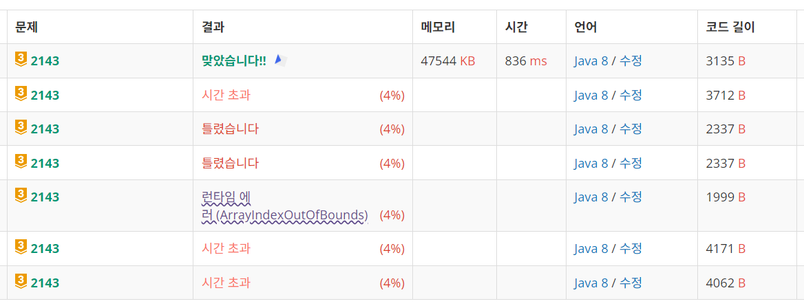 수정한 사항은 위에서 말한 두 가지이다. 첫째는 부배열을 추출하는 방식이다. 원소의 개수별로 즉 연속되는 원소들로 부배열을 추출해야 했기 때문에 반복문을 사용하는 것은 불가피한 방식이었다. 기존의 코드는 1) 원소의 갯수를 지정 2) 시작 원소 인덱스 지정 3) 끝원소까지의 인덱스 이렇게 3중 반복문을 작성하였다. 하지만 개선한 코드는 1차적으로 데이터를 입력받을 때 누적합 배열을 함께 선언해서 입력하는 것이다. 이렇게 작성하면 1번 인덱스에는 1번 원소만, 2번 인덱스에는 첫번째 원소와 두번째 원소의 합이 담기게 된다. 그리고 2번과 3번 인덱스의 합을 구하고자 한다면 누적합 3번 원소에서 1번 원소를 빼주면 되는 것이다.