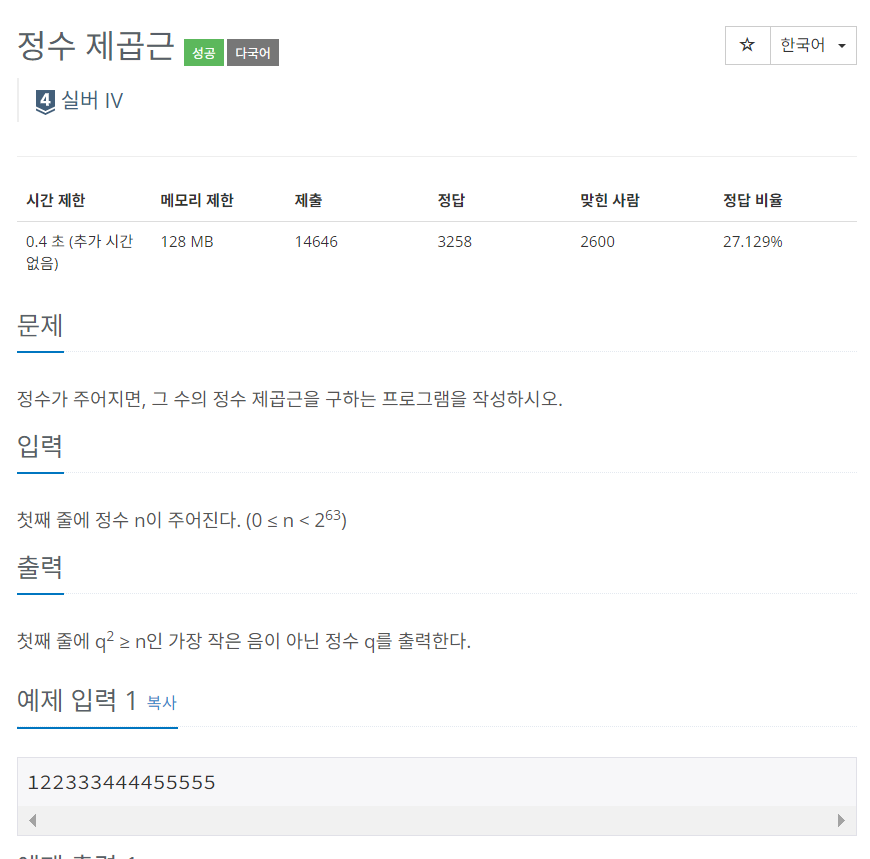 long의 범위에 있는 숫자를 찾으려면 범위가 너무 넓어서 어떻게 l와 r을 설정할지 막막했다. 그래도 달리 방도가 없으니 시작 값을 0으로 두고 끝 값을 주어진 n으로 설정해 이분탐색을 진행했다. 참고로 n의 최대값이 2의 63이니 이 수의 제곱근인 1<<32로 끝 값을 두어도 가능하다. 이분 탐색 시에는 upperBound를 구하는 방식을 사용했다. 여기서 틀렸던 부분은 long인 m을 이용한 제곱값을 구하는 방식이었다. 1) m*m으로 구할 경우 long의 범위를 넘어버림에 따라 예상하는 값이 나오지 않을 수 있다 대신 2) Math.pow(m,2)를 이용한다면 double 범위 내에서 처리하므로 연산 후 안전하게 비교가 가능하다. 사실 직관적으로 이해가 되지는 않지만 코테 때는 둘다 써보고.. 답인 걸로 제출하자.. ^^;;