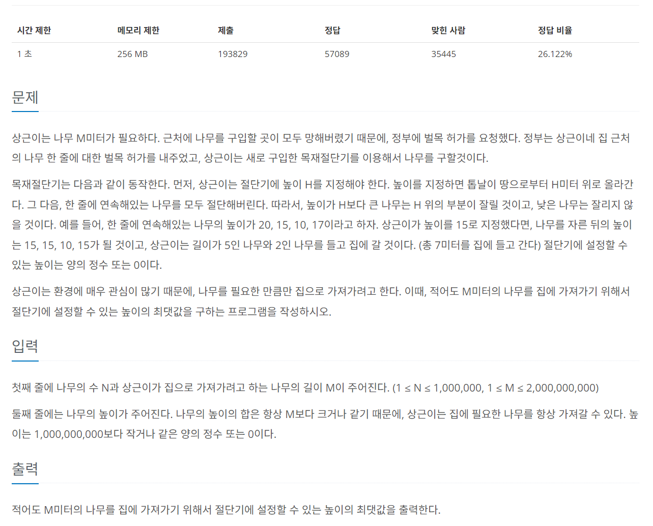long r = max - 1; // m의 최소 길이는 1이기 때문에 가장 큰나무보다 1m 작게 설정