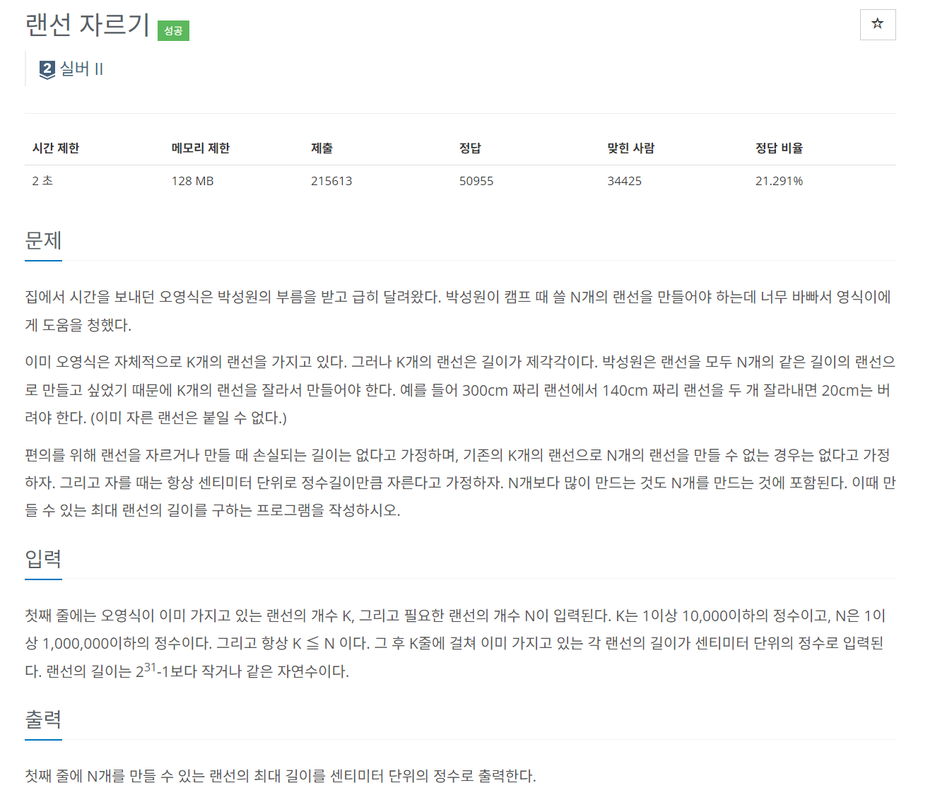 이 문제는 각 랜선은 동일한 길이만 충족하면 되고 해당 길이로 자른 랜선의 갯수가 요구하는 갯수와 일치하면 된다. 여기서 가장 랜선의 길이가 긴 경우를 구하는 문제이다. 기준 길이보다 짧은 랜선이 남았을 경우 버리면 되기 때문에 고려하지 않아도 된다. 이분 탐색으로 길이를 구했는데 의아한 것은 왜 최댓값이 모든 랜선 중 가장 긴 랜선으로 처리하면 틀리고 문제에서 제시한 최대값인 int의 최대 정수를 넣으면 맞느냐는 것이다.. 찾아봤지만 명쾌한 해설을 확인하지 못했고 강의를 들으며 보완해보겠다.