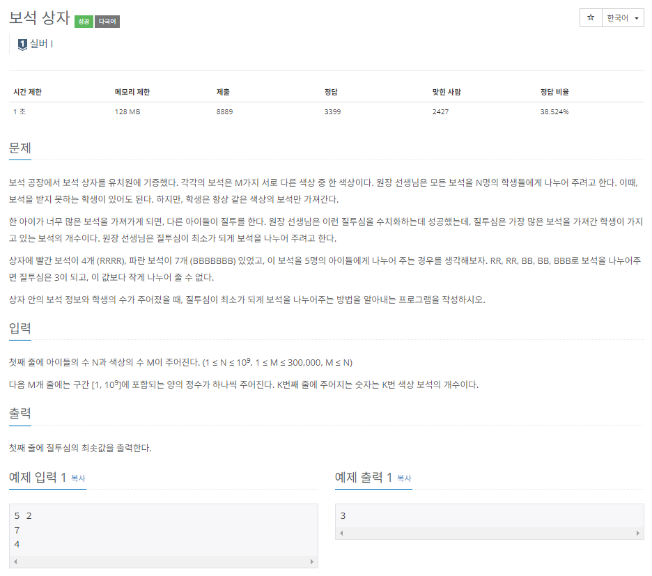 이를 통해 이분 탐색을 진행하고 중간 값인 m 값이 질투심이라고 가정했을 때, 반복문을 돌면서 해당 질투심의 갯수로 몇명의 아이가 사탕을 받을지 cnt로 구한다. 만약 cnt가 학생 수보다 많을 때에는 문제에서 지시함 '모든 보석을 나누어 준다'라는 부분을 충족하지 못하기 때문에 l을 늘린다. 반대로 cnt가 학생 수와 같거나 그보다 적을 때는 더 작은 질투심을 가진 분배가 이루어질 수 있기 때문에 ans로 갱신하면서 r을 줄여준다.