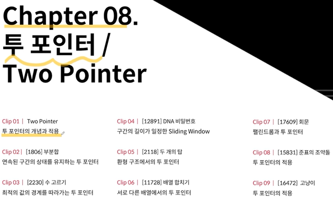투 포인터란 선형 데이터 구조에서 두 개의 인덱스를 관리하여 특정 조건을 만족하는 부분집합이나 특정 값을 찾는 알고리즘을 말한다. 포인터를 사용하는 방식은 다음과 같이 다양할 수 있다. 1) 같은 배열에서 동일한 방향으로 이동하는 투포인터 (이 경우 2003 문제이다.) 2) 같은 배열에서 마주보는 방향으로 이동하는 투포인터 3) 서로 다른 배열에서 이동하는 투포인터. 이때 두 포인터 중 경우에 따라 하나 또는 모두가 끝에 도달할 때까지 반복한다.