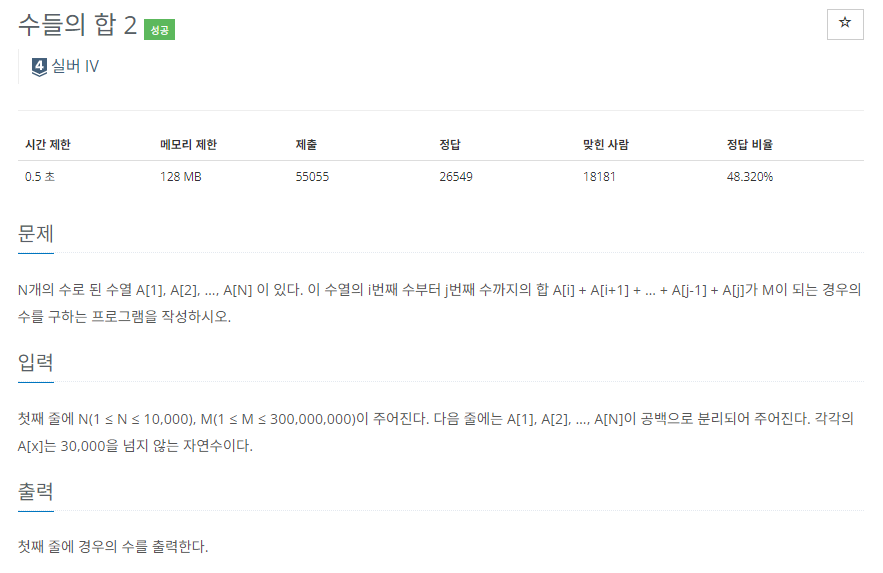 // 시작점의 값을 뺀 기존의 합인 값이 m과 비교해서 작은지 큰지 또 비교한다.
