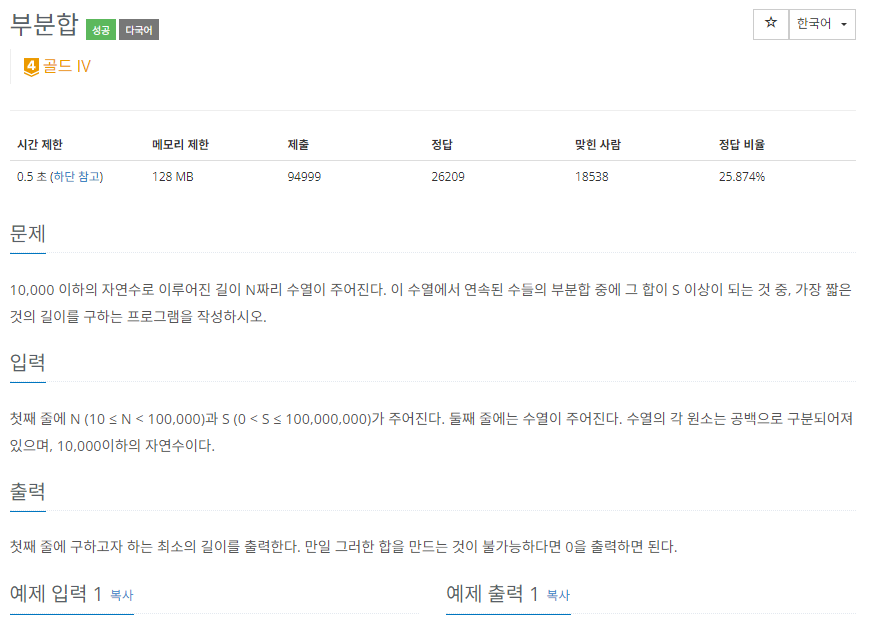 수들의 합 2 문제와 비슷한데 같을 때 뿐만 아니라 초과하는 경우도 찾아야 하고 구간의 길이가 가장 짧은 경우를 그 때 그 때 기록해뒀다가 최솟값으로 갱신해가며 반환하는 문제이다.